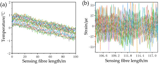 When making coils, the wire and optical fibre will be influenced by positional changes and pulling. In order to ensure that the optical fibre is not damaged during winding, BOTDR is used to monitor the optical fibre strain. A Raman optical time-domain reflectometry (ROTDR) is used to measure the temperature curve on the winding wire and temperature compensation applied according to Equation (4). BOTDR and ROTDR are produced by WEIHAI BEIYANG OPTOELECTRONIC INFO-TECH CO.LTD. The settings of the instrument parameters are shown in Table 2. The temperature sensing length of the optical fibre is set as 100 m, and the ROTDR system measurement error is ±1 °C in the range of 20–90 °C, as shown in Figure 9a. The optical fibre strain sensor range is set to be 105~120 m, and the measurement error of BOTDR is ±50 με in the range of 0~5000 με as shown in Figure 9b. Figure 10 shows that during the winding of the coil, the strain change is smaller than 1400 με. It is far smaller than the range of optical fibre strain measurement. It suggests that the distributed optical fibre sensor maintained its good strain monitoring performance.