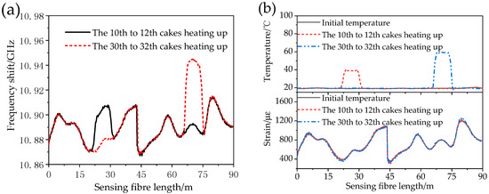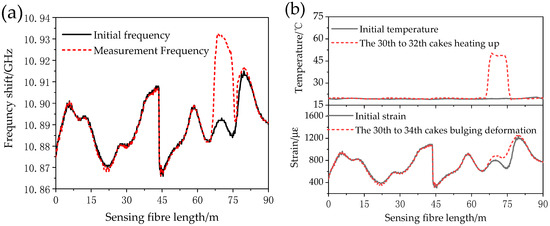 (a) The frequency shift curve of BOTDR and (b) the temperature and strain curves.