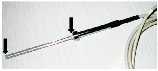 Moisture measurement using the TDR method rely on the determination of the electromagnetic pulse travel time along the rods of the TDR probes (Figure 1), which generally consist of a concentric cable, head and measuring rods buried into the tested material. The readouts are based on the reflections on particular discontinuities of the sensor waveguide, being the elements of its construction. Usually, the described discontinuities are located at the beginning and the end of probe. Figure 1 shows an exemplary TDR probe, with black arrows marking the discontinuities of waveguide for the electromagnetic pulse. During measurement the rods have to be inserted into the tested material. The contact between the rods and tested material should be precise and permanent to allow the reliable readouts.