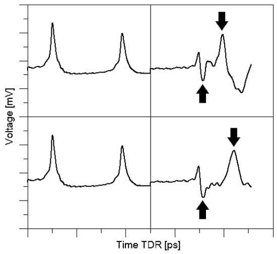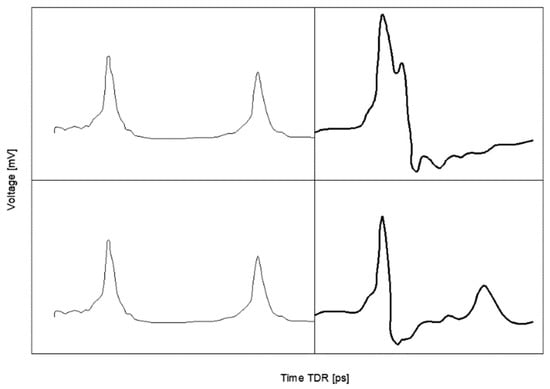 Example of TDR waveforms for dry (top) and moist (bottom) material acquired from an ETest LP/ms TDR probe (own elaboration based on calibration tests). Left-hand side—control peaks, right-hand side—measuring peaks.