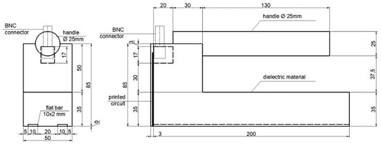 The subject of study was a TDR surface sensor developed to examine moisture content of rigid porous media as building materials, building barriers or rocks. The prototype specimen applied for the presented research was constructed of black polyoxymethylene (POM)—plastic characterized by good mechanical parameters including strength, stiffness, ductility and value of apparent permeability at the level of 3.8 [7]. The length of the probe and waveguide was equal 200 mm, while width 50 mm. Measuring elements were manufactured from brass flat bar 2 mm × 10 mm. The device was equipped with a cylinder shaped handle. Communication between the probe and the TDR multimeter was provided by the BNC connector with simple printed circuit consisting of the two lines soldered to the pins of the BNC connector and both bars on the other side. There was a resistor soldered between two lines. A schematic view of the proposed surface TDR sensor construction is presented in Figure 3.