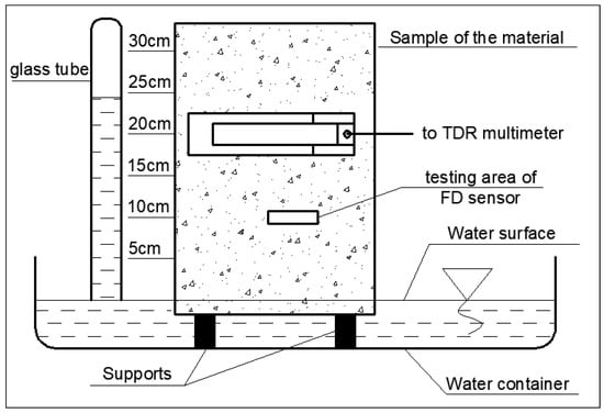 The aim of the laboratory research was to assess the measurement potential of the prototype TDR sensor and to demonstrate its applicability in practical aspects as well as to compare its measuring features with a popular moisture sensor available on the market. The research was focused on monitoring of water transport in the model aerated concrete wall barrier utilizing newly developed TDR sensor and the Label LB-796 capacitive FD sensor (LABEL, Reguły, Poland), providing satisfactory readouts of moisture in building barriers, being successfully used for expertises concerning water damage of the buildings. The applied sample was cut from the concrete block to the dimensions of 240 mm × 240 mm × 350 mm, dried to constant mass and covered with thin layer of the bitumen isolation in order to minimize the environmental impacts on the studied process. The scheme of capillary rise monitoring in aerated concrete is presented in Figure 5. The studied sample was inserted approx. 1 cm below the distilled water surface in the reservoir. The water level was kept constant with the help of the glass tube filled with water. The measurements points were assigned in 5 cm interval (levels 5, 10, 15, 20, 25 and 30 cm) above the water surface. During the measurement the TDR sensor was carefully contacted to the tested sample maintaining the constant pressure. The middle of its width was positioned at the particular measuring levels as visible in Figure 5. The similar procedure was repeated for the applied FD sensor, according to the producer’s recommendations.