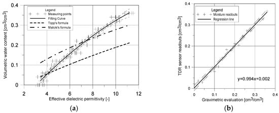 With the calibration procedure the dependence between effective dielectric permittivity (read by the TDR surface sensor) and the volumetric water content was achieved. The results are presented in Figure 6a.