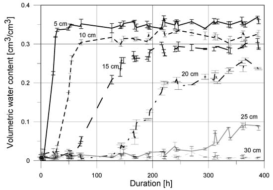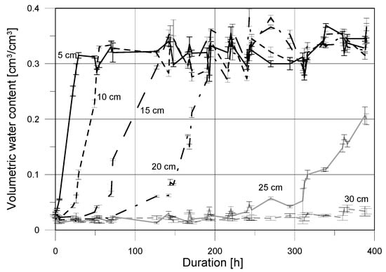 The measurements of capillary rise in the sample of aerated concrete utilizing the invasive TDR probes were performed by Hansen [47] and during the earlier studies by Suchorab et al. [48]. The aerated concrete researched by Hansen [47] had apparent density of 500 kg/m3, lower than tested in this paper, so installation of the invasive TDR probes could be easier. The probes were installed at the following heights over the water table 15, 30, 45, 60, 75 and 90 mm, lower and with smaller spacing than applied in our research. Thus, the first registered readouts of water content for the lowest level, 5 cm above water level, were observed after approx. an hour and after 5 h the conditions near full saturation were noted. The increase in water content for higher levels were observed respectively later. To compare the dynamics of the studied processes, the readouts of water content at the height of 90 mm reported by Hansen [47] and 100 mm obtained during the presented studies were analyzed. In case of the surface TDR probe the appearance of water was observed after approx. 20 h and the full saturation after approx. 80 h, while the comparable values were reported by Hansen [47] after approx. 60 and 100 h, respectively. But, the full saturation was probably not achieved, because lower sensors showed higher values of moisture readouts in several points.