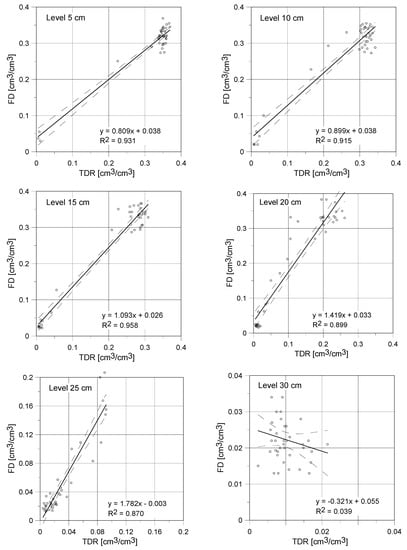 - the maximal noted standard deviation for the TDR sensor was equal to 0.012 cm3/cm3 with the maximal standard deviation for the FD probe was higher, reaching 0.037 cm3/cm3.