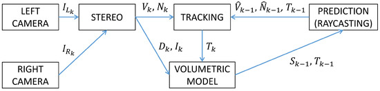The base algorithm used in this work is an implementation of KinectFusion [15], a real-time 3D mapping and tracking method developed for use with the Microsoft Kinect and similar RGBD sensors. Although there has been some research done on using range sensors in water [37,38], the results have been of very limited practical use due to difficulties in dealing with light refraction and attenuation, which means that even in good visibility the maximum achievable range is about 20 cm. To overcome this limitation, the work presented in this paper relies on two synchronised colour cameras producing a stereoscopic image pair for disparity estimation. Figure 1 shows the overall workflow of the StereoFusion algorithm.