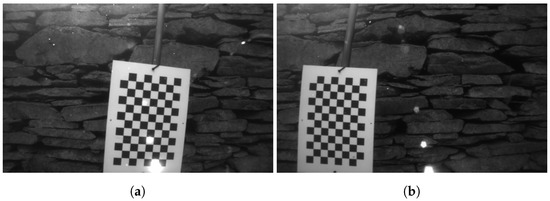 The cameras have been calibrated underwater on-site, using a 7 × 11 chessboard with the sides of each square measuring 280 mm, as shown in Figure 5. The chessboard has been printed on an A3 sized ( mm) PVC board, which was then attached on a pole in order to submerge it and move it manually from the side of a pier. The cameras have been calibrated using a pinhole camera model, and the distortion corrected using the plumb bob model (radial polynomial + thin prism model) [51].