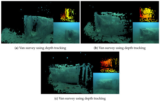 Figure 11 shows snapshots of the survey, which was performed by manually piloting the ROV in a circle around the target. Unlike in the scenario described in Section 5.1, in this case, the colour tracker proved to have a significant advantage over the depth tracker. This is due to the target’s geometry, i.e., the beams from which the metal frame is composed are relatively thin and do not always appear clearly in the depth map.