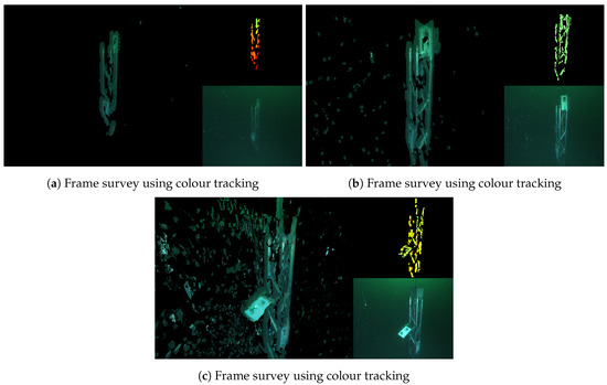 Figure 7a–e show images of the algorithm running during a survey of a submerged boat, about 6 m in length. Figure 7f is from a different survey of the same boat, but this time using the colour tracker from Section 3.3.2. In the quarry, both trackers performed equally well, producing good reconstructions and providing reliable camera tracking.