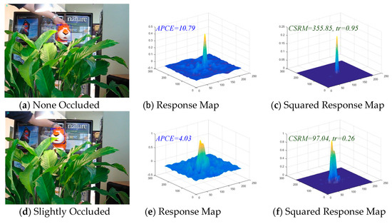 Unlike the APCE, the proposed method in this article squared the value of response map (the proof is given in Appendix A) and then calculated the value of Confidence of Squared Response Map (CSRM). CSRM stands for the fluctuated degree of the response maps and the confidence level of the detected targets. The numerator of the CSRM represents the peak of the response map, and the denominator of CSRM represents the mean square value of the response map. Figure 4c,f,i illustrate that if the target is not occluded or contaminated, the corresponding response map presents a sharp peak. It is concluded that when the peak value is larger and the mean square value is smaller, and the result is that the corresponding CSRM value is larger. On the contrary, if the target is occluded or contaminated, the corresponding response map will present a smoother peak and even multiple peaks. It could be concluded that when the peak value is smaller and the mean square value is larger, and the result is that the corresponding CSRM value is smaller. This increases the gap between the confidence response and the diffident response as shown in Figure 4, making it easier to find the threshold between them. Consequently, a threshold is set to distinguish whether the target is occluded or contaminated and an adaptive learning rate is set by Equation (20) to prevent the model from being corrupted. In addition, Equation (20) is effective and accurate for model learning which can be readily and neatly integrated into DCF-based trackers to improve the tracking performance.
