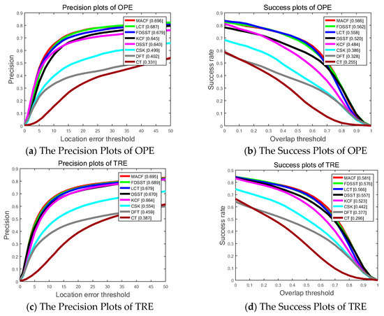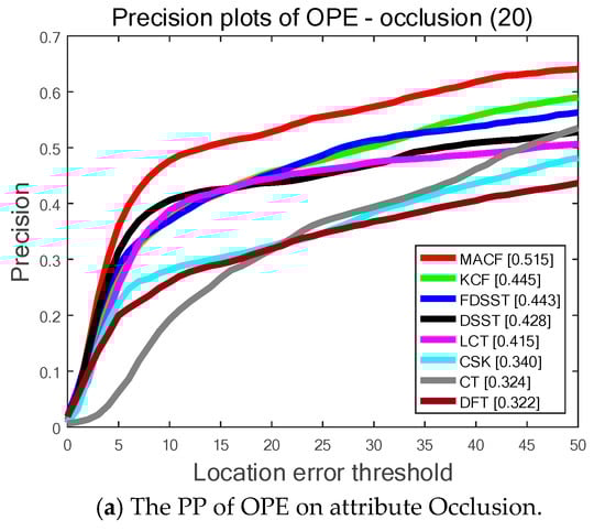 Figure 6 and Table 2 show the SP of OPE, TRE, and SRE utilizing the LET. The PP of OPE, TRE and SRE using OT with the total 50 sequences on OTB-50 are also shown in Figure 6. Generally, the proposed MACF acquires the best results of the top eight trackers including 65.1%, 59.7% and 65.1% in OPE, TRE and SRE, respectively, of LET at 20 pixels and 52.3%, 47.1% and 54.4% in OPE, SRE and TRE, respectively, of OT at 0.5. Furthermore, the proposed MACF achieves a visibly gain of 4.3%, 4.1% and 2.3% in OPE, SRE and TRE, respectively, of LET at 20 pixels and a gain of 1.7%, 2.9% and 1.4% in OPE, SRE and TRE, respectively, of OT at 0.5 compared to the standard FDSST.