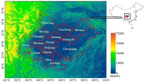 The geographic location and terrain of the study area (Chengdu–Chongqing Economic Zone) in China.