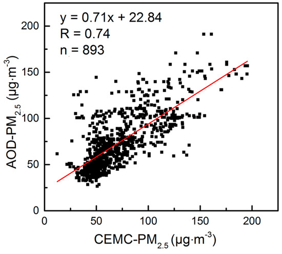 Scatter plots of the monthly PM2.5 (µg·m−3) mass concentrations over CEMC observations and AOD-estimated PM2.5 from 2013 to 2015.