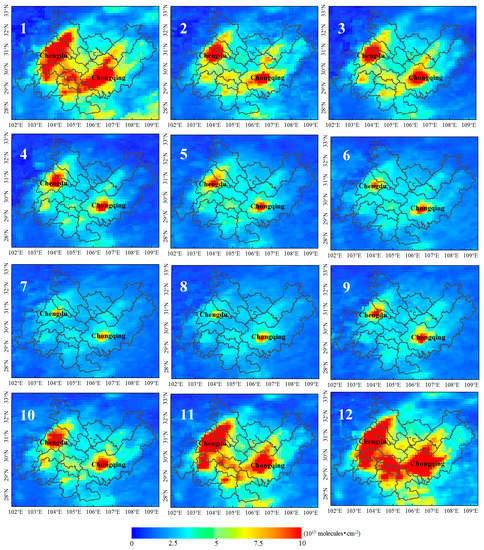 This study analyzed the spatial–temporal distributions in NO2 and PM2.5 using satellite remote sensing data in the CCEZ over 11 study years. Geographically, the area with the highest level of column NO2 is Chengdu, which presented an average value of 848.55 × 1013 molecules·cm−2 in the 11-year study period. The area with the highest near-surface PM2.5 concentration is Zigong, which presented an average value of 91.34 µg·m−3 over the 11-year study period. The area with the lowest concentration of NO2 and PM2.5 is Ya’an, which presented average values of 91.34 µg·m−3 and 53.26 µg·m−3 over the 11-year study period, respectively.