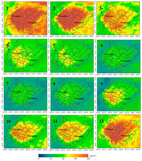 This paper presents the monthly average spatial distributions of the NO2 column concentration and PM2.5 mass concentration for the 11 years between 2005 and 2015. The spatial and temporal distributions of NO2 are shown in Figure 4. Highly polluted areas were distributed in the center of Chengdu and the main urban area of Chongqing. Along the border of the CCEZ (Ya’an, northern Mianyang, southern Leshan, northern Dazhou, and northeastern Chongqing), the pollution concentration was very low (NO2 < 250 × 1013 molecules·cm−2) throughout the year, and slight pollution (250 × 1013 molecules·cm−2 < NO2 < 500 × 1013 molecules·cm−2) was observed in December and January in southern Leshan and northeastern Chongqing. The highest levels of pollution were recorded in November, December, and January, and high-value areas were concentrated in the western and southern CCEZ and in most of the areas in and around the main urban area of Chongqing. The extent of highly polluted areas decreased considerably from February to March, and those of both highly and moderately polluted areas decreased on a monthly basis from April to August. However, the extents of areas with high and moderate pollution increased in September and October. The monthly mean distribution of PM2.5 is shown in Figure 5, which indicates that the overall pollution along the border area of the CCEZ was relatively low (PM2.5 < 60 μg·m−3) throughout the year. The highest levels of pollution (PM2.5 > 90 μg·m−3) were recorded in January, and even the border area pollution level, which was relatively low compared with those in other areas, was approximated high. The high-value areas in February were similar to those in January, and the pollution along the Chengdu–Chongqing boundary decreased to moderate levels. The areas with high levels of pollution decreased in March and December, and the high- and median-value areas (60 μg·m−3 < PM2.5 < 90 μg·m−3) overlapped. Higher levels of pollution were recorded in the border area in December than in February. In April and May, the extents of the high- and median-value areas decreased sharply, and areas with medium and high levels of pollution around Zigong and Chengdu intersected. From June to August, the entire area was slightly polluted; from September to November, the extents of the high- and median-value areas began to gradually expand to include most of the CCEZ, and the extents of the high-pollution areas in December were similar to but slightly heavier than those in March.