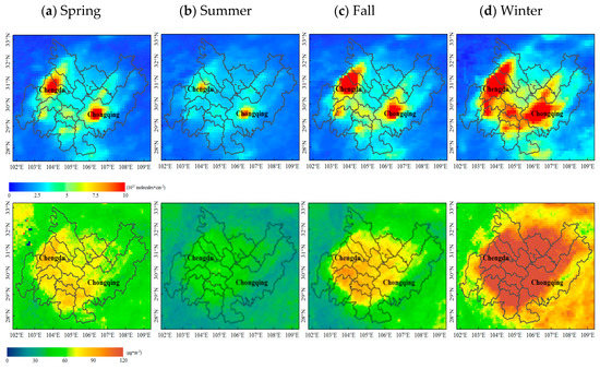 Seasonally averaged NO2 (upper panel) and PM2.5 (lower panel) concentration distributions in the CCEZ from 2005 to 2015 (Spring: March, April, and May; Summer: June, July, and August; Fall: September, October, and November; and Winter: December, January, and February).