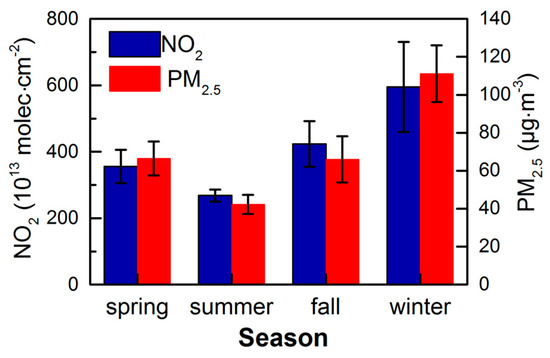 Seasonal variations in the NO2 and PM2.5 concentrations in the CCEZ from 2005 to 2015; error bars represent standard deviations.