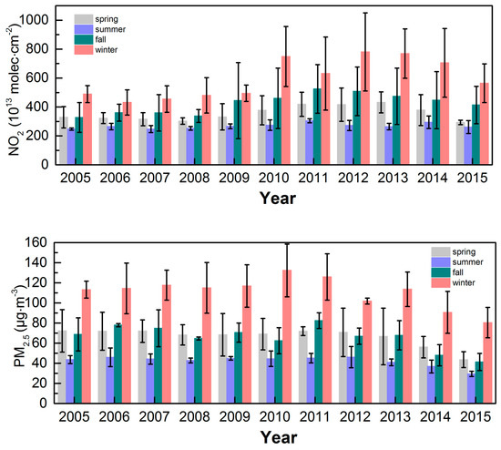 Seasonally averaged NO2 (1013 molecules·cm−2) (upper panel) and PM2.5 (µg·m−3) (lower panel) concentration changes in the CCEZ from 2005 to 2015; vertical bars represent standard deviations.