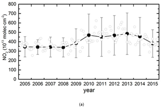We used the monthly average data of 2005–2015 and the regression model developed by Lamsal et al. to compare the interannual changes over the 11-year period in the CCEZ [40,41,42]. The time series of the monthly average consists of three parts: the seasonal trend, linear trend, and irregular fluctuation: