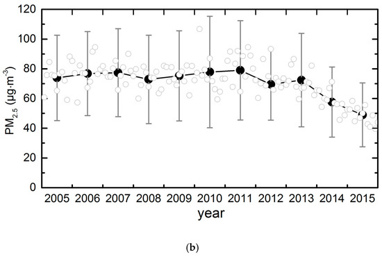 Changes in the annual average NO2 (a) and PM2.5 (b) concentrations in the CCEZ during 2005–2015; gray circles represent deseasonalized monthly columns, while black-filled circles show the annual means, and vertical bars show the standard deviations.