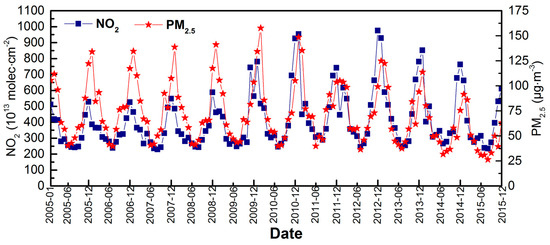 During our study period, NO2 presented relatively greater fluctuations. From 2005 to 2011, the concentration of column NO2 showed annual increases and reached a high value of 953.33 × 1013 molecules·cm−2 in January 2011, after which the column NO2 concentration showed a downward trend, although it increased in 2013 and then continued to decline. From 2005 to 2011, the concentration of PM2.5 was basically unchanged and presented an annual average of 76.52 µg·m−3. After 2011, the concentration of PM2.5 began to decline sharply, and the lowest value of 26.43 µg·m−3 was found in August of 2015.
