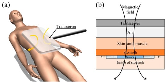 To apply the developed sensor in a real application, misalignment between the sensor and the transceiver should be overcome. To minimize the misalignment effect, the transceiver is suggested to be large enough to cover the entire abdomen as illustrated in Figure 1a. By creating a magnetic field as uniformly as possible throughout the abdomen, the sensor can keep relatively constant coupling with the external transceiver even if the exact location of the sensor is unknown. As shown in Figure 1b, the distance between the sensor and the transceiver can be determined by knowing the distance from the abdominal surface to the sensor, which could be measured by a physician during the surgery or by a medical imaging method. Therefore, it would be possible to detect the deformation of internal organs such as the stomach. To minimize the variations in stomach conditions and posture, the patient would be asked to stay with a constant posture, e.g., laying down on a bed, during the detection. Also, checking the stomach motility would be performed a few days after the gastrectomy, in which duration the food intake is generally restricted and thus, the stomach condition is expected to be quite constant. However, all such aspects need further investigation including animal experiments.