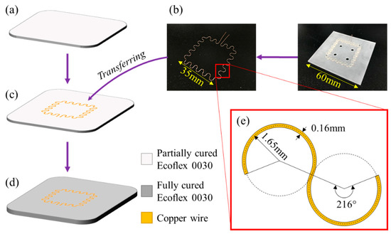 Fabrication process of the wireless strain sensor: (a) curing the substrate partially, (b) patterning the copper wire in serpentine shape, (c) transferring the pattern and (d) curing the device completely. (e) Detailed design of the serpentine pattern of the coil.