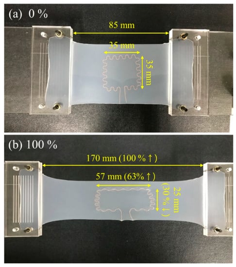 Photographs of the wireless strain sensor in (a) non-stretched and (b) 100% stretched states.