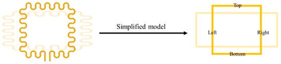 The behavior of the proposed sensor was first predicted by simulations based on calculation. Due to the practical limitation that finite element method (FEM) simulation of electromagnetic fields is time consuming, we simplified the serpentine pattern as a straight line, so the shape change of the serpentine pattern could be simplified to the change in aspect ratio of a rectangle as illustrated in Figure 4. The inductance of the simplified model was calculated as the sum of self-inductances and mutual inductances of all line segments, based on the Greenhouse method []. In the Greenhouse method, the inductance is expressed as the sum of self-inductances and mutual inductances of each segments. The inductance L is given by