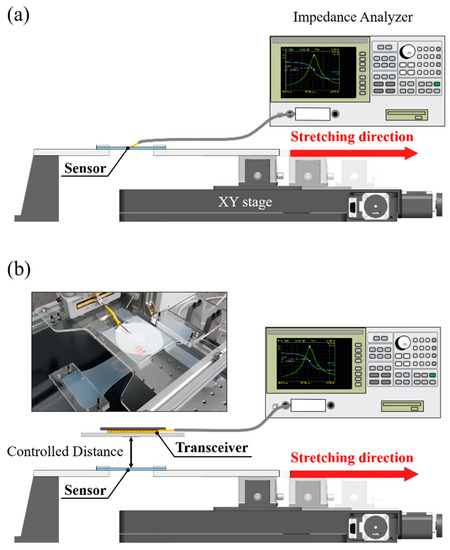 To verify whether the change in sensor strain results in resonant frequency shifting, the experimental test bench was constructed as shown in Figure 6a. An impedance analyzer (4294A, Agilent, Santa Clara, CA, USA) was directly connected to the sensor to measure the impedance, and the strain applied to the sensor was controlled by an XY stage (CROSS 130-HSM, OWIS®, Staufen, Germany). Since the applied strain and the impedance should be measured at the same time, a LabVIEW-based program (LabVIEW 2016, National Instrument, Austin, TX, USA) was used to control the XY stage and the impedance analyzer simultaneously. Because the available travel range of the XY stage was limited, the sensor was stretched up to 110% at maximum. From each impedance measurement, the resistance, inductance, and capacitance of the sensor were evaluated using the equivalent circuit model, in which the resistance and inductance are connected in series and capacitance connected to those in parallel []. Figure 6b shows the experimental setup to observe whether the change in strain of the sensor can be measured wirelessly and to investigate the maximum distance of wireless detection. The deformation of the sensor was measured wirelessly using a transceiver, which was a circular planar coil with 15 turns, an outer diameter of 65 mm and a wire diameter of 1 mm, resulting in a self-inductance of 10 μH and the quality factor of 71. The impedance of the transceiver was measured as the strain applied to the sensor varied from 0% to 100%. The distance between the sensor and the transceiver was varied from 10 mm to 50 mm to observe the maximum distance for wireless sensing. The centers of the sensor and the transceiver were aligned manually at every measurement step. Since the purpose of the wireless sensing setup was to observe the modulation of resonant frequency at the transceiver with varying the vertical distance, the influence of coil misalignment was excluded.