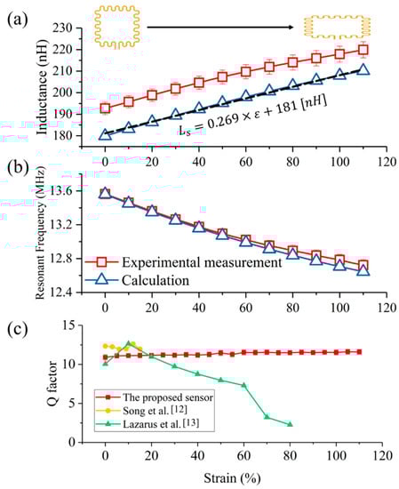 (a) Inductance change and (b) shift in resonant frequency of the sensor according to changes in strain, calculated using the Greenhouse method and measured experimentally. (c) Quality factor of the sensor as a function of strain, and compared with other sensors reported in previous studies [,].