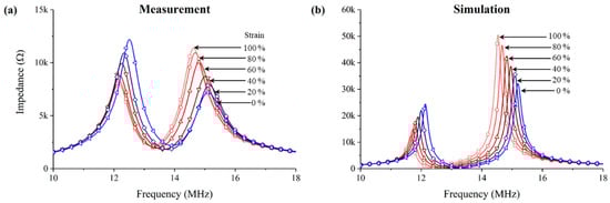 Experimentally measured and simulated impedance magnitudes of the transceiver at 10 mm away from the sensor. The frequency of the right peak was shifted (a) from 15.01 MHz at 0% strain to 14.59 MHz at 100% strain in experiment, and (b) from 15.31 MHz at 0% strain to 14.47 MHz at 100% strain in simulation.