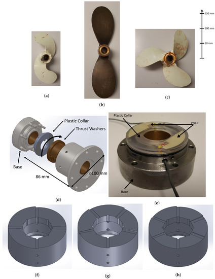 The two-blade (a), brass two-blade (b) and three-blade (c) propellers used in the experiment. (d) Assembly drawing of the thrust bearing. (e) The thrust bearing washer with embedded PVDF film. The four (f), five (g) and six (h) pad bearings used.