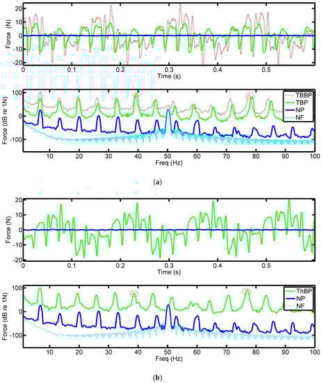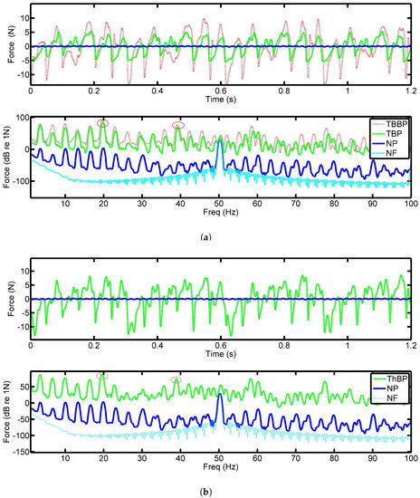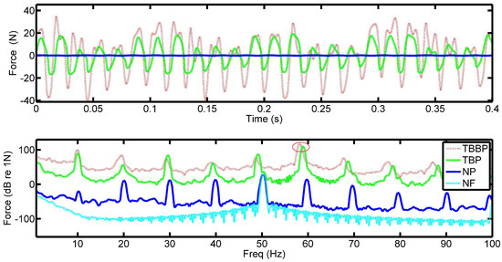 Captured force from the PVDF with the (a) two-blade propeller, (b) three-blade propeller rotating at 400 RPM with a six-pad bearing, time (top) and frequency (bottom) data. Where: TBBP–Two-blade brass propeller, TBP–Two-blade propeller, ThBP–Three-blade propeller, NP–No propeller, NF–Noise floor.
