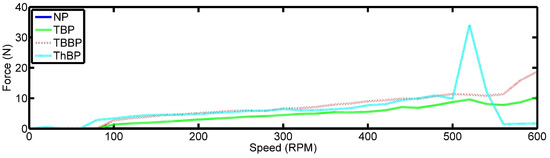 The final configuration, the three-blade propeller, is shown in Figure 8d. The engagement force required for this configuration is achieved at a slower shaft rate of 80 RPM. The inconsistencies seen in Figure 8d at 520 RPM are a result of delamination of the PVDF sensor (see Figure 7 and associated discussion). The sensors appear to recover at 540 RPM but fail again at higher speeds.