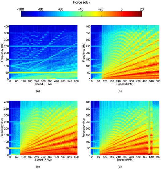 The resulting spectrum when the two, two-blade propellers were attached to the end of the shaft are shown in Figure 8b,c. From the Figure, the previously discussed engagement force required for the thrust bearing can clearly be seen in both data sets, which is achieved at 100 RPM. Below this speed, the spectrogram is very similar to that of just the shaft spinning. The 50 Hz electromagnetic noise is present, however, compared to the shaft rate and the PPF, this is considered reasonable. The shaft rate can be seen with its harmonics, however, the largest signature seen is six times the shaft rate which corresponds to the PPF of the system. The two propellers produce similar spectrograms, which is to be expected as the excitation frequencies will be similar, however, there are slight differences concerning their magnitudes.