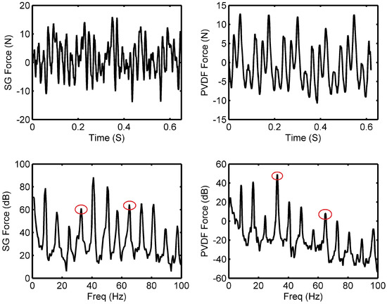 Comparison of the predicated force of the thrust bearing to the localised force measured by the PVDF film for the brass two-blade propeller, four Pad thrust bearings rotating at 500 RPM. Where (top) is the time domain and (bottom) is the frequency domain. The circles indicate the PPF and the modulation frequency.