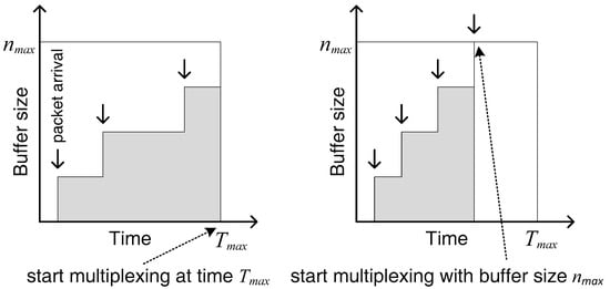 In the simulation model, the multiplexing transition probabilities are figured out by using a method of packet counting where is the likelihood of th packet arrival prior to the start of packet multiplexing such that packets are already present in the buffer and . In the simulation model, for determining the values of , is considered as the maximum number of small data packets in the buffer multiplexed to form a large packet. So could get a value in the range .