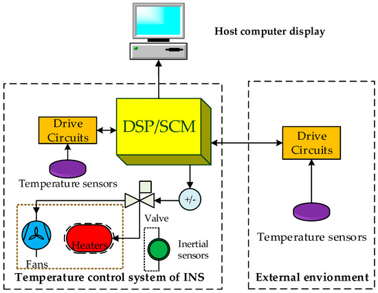 The temperature control system is often utilized to ensure that the temperature of the inertial sensors is close to constant and is less affected by the environment temperature fluctuation for the INSs. That is, the temperature control system keeps the temperature of the inertial sensors within a certain range while maintaining a high accuracy value. A typical temperature control system uses heaters (fans) to heat (cool) the INS in accordance with the temperature measured by the sensors (Figure 1).