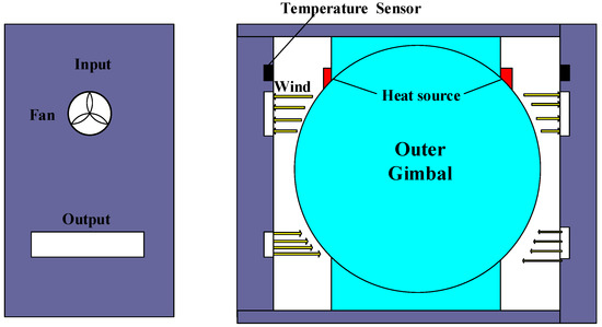 To overcome the two shortages mentioned above, the structure between the temperature control system and the outer gimbal is optimized as shown in Figure 11. In the outlet, the copper plate is utilized to prevent the air from blowing directly at the outer gimbal, and the wind blows at the lower left and right sides of the space between the temperature control system and the outer gimbal. Thus, the temperature of gimbal is less affected by the heaters. In the inlet, the same copper plate is applied to accelerate air circulation by decreasing the inlet area and using a slant structure. In this way, the temperature sensors are less affected by the heat sources. Thus, the practical temperature of the air between the temperature control system and the gimbals is measured by the temperature sensors and adjusted by the temperature control system. The structure of the temperature control system is optimized by us. The specific control algorithm which can be found in reference [22] is not modified in this study.
