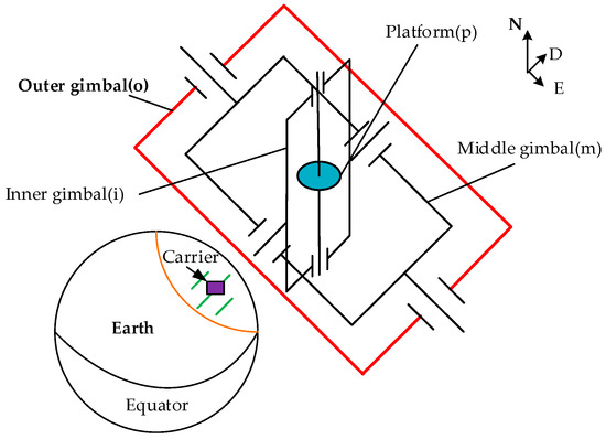 To simulate the heading rotation of the carrier, the mathematical relationship between the heading and the gimbal angles of the navigation system is deduced as follows. Here, the four-gimbal platform INS is taken as an example. As shown in Figure 4, the four-gimbal platform INS consists of the outer (color red), middle, inner, and platform gimbals. The motion of the carrier is isolated using servo control of the four gimbals.