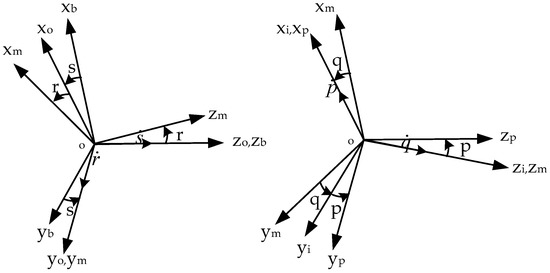 To establish the kinematics model of the four-gimbal platform INS, the coordinate systems connected to each part are introduced separately. Five coordinate systems are involved, namely, carrier body coordinate system (b-frame), outer gimbal coordinate system (o-frame), middle gimbal coordinate system (m-frame), inner gimbal coordinate system (i-frame), and platform coordinate system (p-frame). The geometric relationship among the coordinate systems is shown in Figure 5.