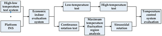 Inertial navigation systems (INSs) use the temperature control system to ensure the stability of the temperature of the inertial sensors for improving the navigation accuracy of the INSs. That is, the temperature control accuracy affects the performance of the INSs. Thus, the performance of temperature control systems must be evaluated before their application. However, nearly all high-precision INSs are large and heavy and require long-term testing under many different experimental conditions. As a result, conducting an outdoor navigation experiment, which involves high–low temperature and heading rotation tests, is time consuming, laborious, and costly for researchers. To address this issue, an economical high–low temperature and heading rotation test method for high-precision platform INSs is proposed, and an evaluation system based on this method is developed to evaluate the performance of the temperature control systems for high-precision platform INSs indoors. The evaluation system uses an acrylic chamber, exhaust fans, temperature sensors, and an air conditioner to simulate the environment temperature change. The outer gimbals of the platform INSs are utilized to simulate the heading rotation. The temperature control system of a high-precision platform INS is evaluated using the proposed evaluation method. The temperature difference of the gyros is obtained in the high–low temperature test, and the temperature fluctuation of the temperature control system is observed in the rotation test. These tests verify the effectiveness of the proposed evaluation method. Then, the corresponding optimization method for the temperature control system of this high-precision platform INS is put forward on the basis of the test results of the evaluation system. Experimental results show that the maximum temperature differences of the two gyros between high- and low-temperature tests are decreased from 1.51 °C to 0.50 °C, and the maximum temperature fluctuation value of the temperature control system is decreased from 0.81 °C to 0.27 °C after the proposed evaluation and optimization processes. Therefore, the proposed methods are cost effective and useful for evaluating and optimization of the temperature control system for INSs.