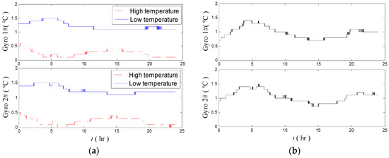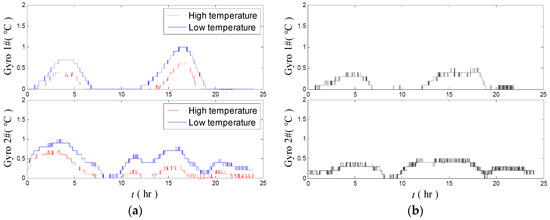 Figure 7a shows the temperature fluctuations of the two gyros in the high–low temperature tests in 24 h. Figure 7b indicates the temperature calculated difference of the same gyros between the high- and low-temperature tests. The average temperature differences of both gyros are at 1.0 °C level, and the highest temperature difference reaches 1.51 °C. These findings imply that the temperature control system of the platform INS should be improved further.