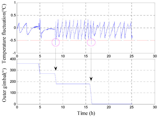 As shown in Table 1, the gimbal first rotates from 360° to 270° with a uniform rotation rate of 0.1°/s. The gimbal pauses at 270° for several minutes to decrease the effect of previous rotation to the next one. Then, the gimbal rotates from 270° to 180°. A large temperature fluctuation is observed. Thereafter, the outer gimbal rotates from 180° to 0° directly because the internal structure of the INS is approximately symmetric. The second region with excessive temperature fluctuation is observed as expected (Figure 8).