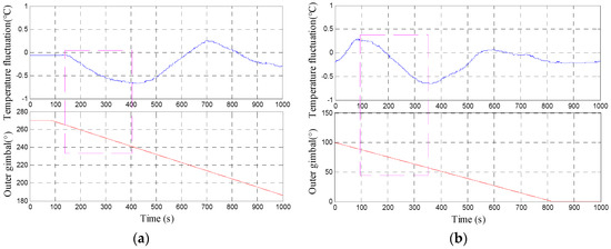 Figure 8 shows the temperature fluctuation curve of the temperature control system, which is obtained by rotating the outer gimbal uniformly in the entire cycle. As shown in the figure, two regions have excessive temperature fluctuation. The symmetry of the two regions can be observed clearly in the partially enlarged Figure 9a,b, which indicates that the entire structure of the INS is symmetric. The maximum temperature fluctuation reaches 0.68 °C.