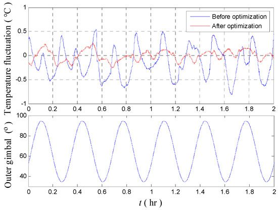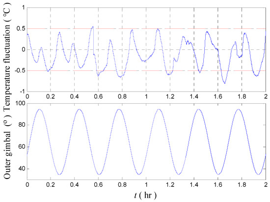 The reason for the large fluctuation of the temperature control system in the heading rotation is analyzed as follows. The heat sources are close to temperature sensors when the gimbal rotates to 60–70 ° and 240–250°, as shown in Figure 8 and Figure 9. When the outer gimbal rotates to the position where the temperature sensors are close to the heat source, the value given by the temperature sensors increases quickly. Unfortunately, the values given by the temperature sensors are used to provide temperature reference for the temperature control system. Accordingly, the temperature control system will cool the air between the temperature control system and outer gimbal. If the outer gimbal rotates continually, then the temperature sensors move far from the heat sources. At the same time, the temperature of the air has been cooled by the temperature control system. Then, the temperature is decreased quickly (Figure 10). The fluctuation environment temperature is within 1.0 °C, but the temperature control error of the temperature control system reaches 0.6 °C.