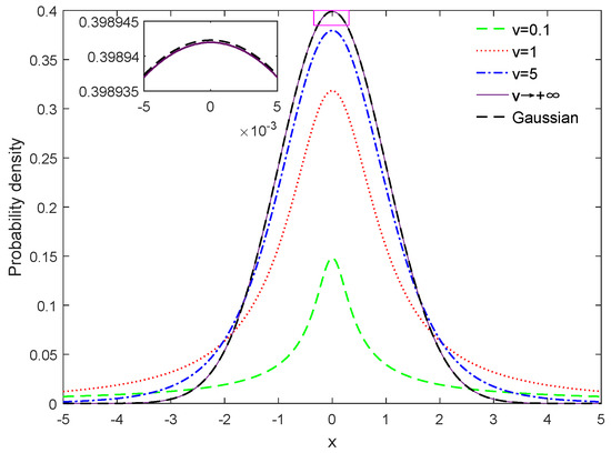 Figure 1 illustrates the Student’s-t distribution with fixed mean vector and covariance matrix but various degrees of freedom. It can be seen that the Student’s-t distribution degrades the Gaussian distribution in the limit . Moreover, the tail of the Student’s-t distribution tends to be heavier when the degree of freedom . Therefore, the Student’s-t distribution possesses the potentiality to mitigate the adverse effect of outliers in contrast to the Gaussian distribution.