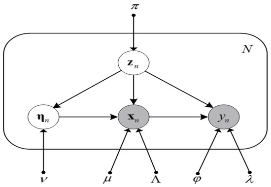 where the mixing coefficients satisfy together with . In addition, let us introduce a K-dimensional assignment latent variable associated with , in which for are binary variables, i.e., . In addition, only one of the for can be assigned with value 1, and the rest ones are all 0. Therefore, we have the constraint . If certain , it means that the k-th component is responsible for generating the corresponding observed sample.