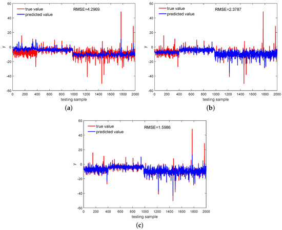From Figure 11a,b we can recognize that: (1) the selected optimal values of K and initialized model parameters upon the validating dataset can basically embody the true generalization performance upon the testing dataset for the GMR and SMR-based soft sensors; (2) upon both the validating and testing dataset, although with small values of , the performances of the two soft sensors are comparable, and the SMR-based soft sensor starts to show apparent predictive advantage over the GMR-based one as ; (3) the number of components is much larger than the number of operating conditions, because each operating condition may consist of several modes. The underlying reason for this phenomenon is that for complex processes, one Student’s-t distribution still does not model one operating condition well, and more Student’s-t distributions are required for one operating condition; and (4) the number of components is mainly determined through the division of the spatial pattern of input and output variables rather than the number of input variables, so there is no relationship between the number of components and the number of input variables in the mixture models.
